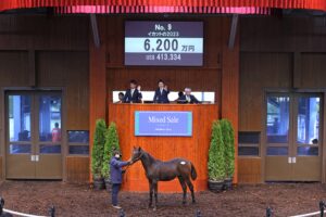 サトノセプターは、父kingman・母イカットの牡馬、2023年の当セール当歳部門に上場され、里見 治 様が落札、ご購買いただきました。