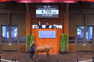 サトノリシャールは、父レイデオロ・母ストーミーエンブレスの牡馬、2023年の当セール当歳部門に上場され、里見 治 様が落札、ご購買いただきました。
